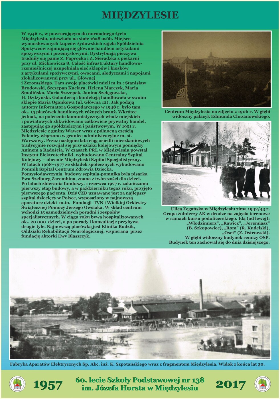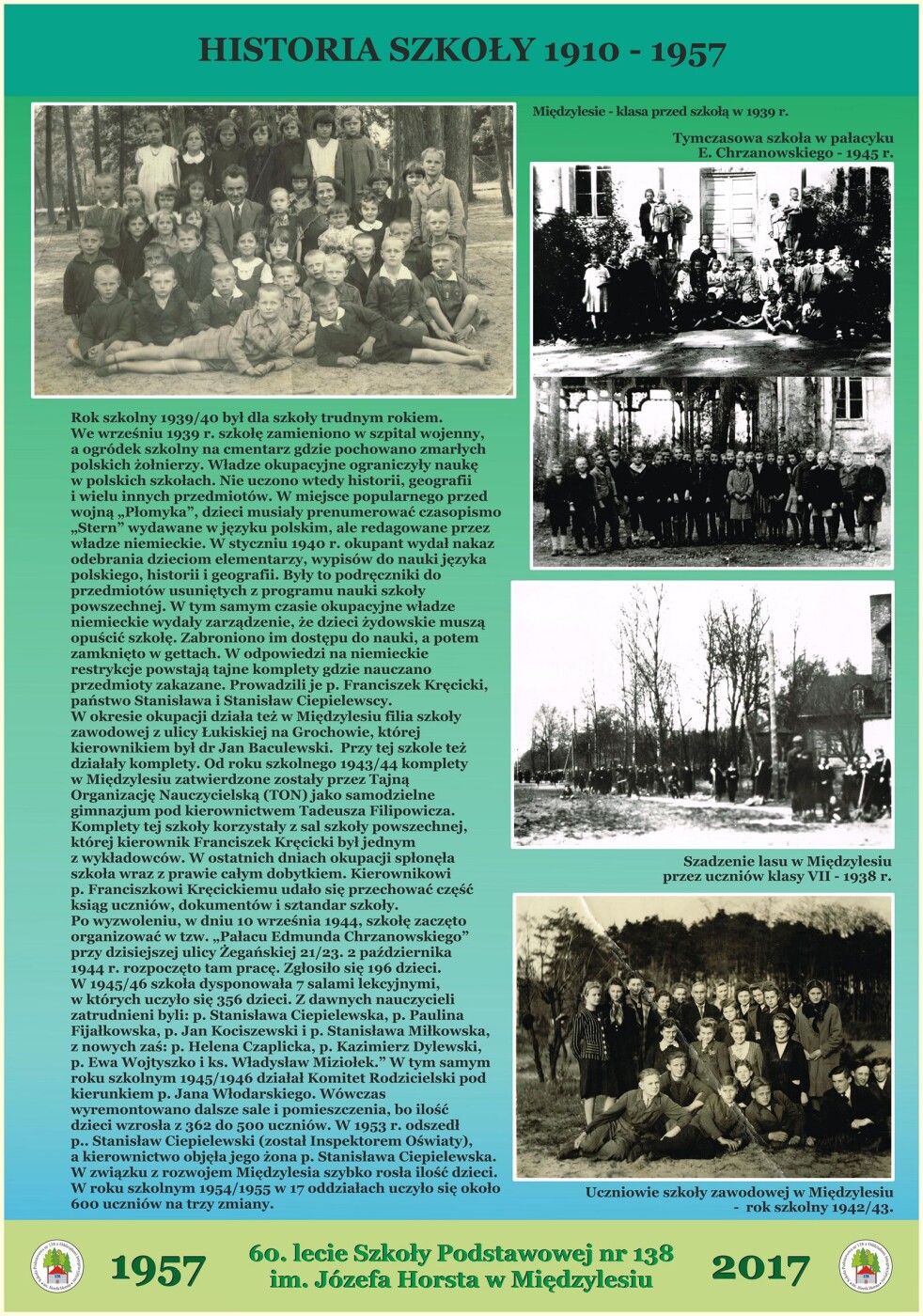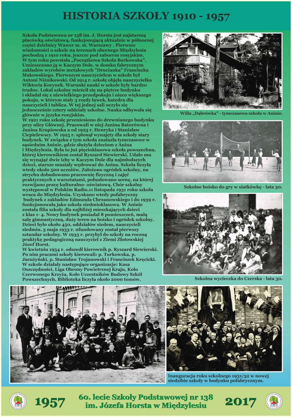 7-mio Kl. Publiczna Szkoła Powszechna w Międzylesiu - była to pierwsza i jedyna szkoła w tym rejonie obejmująca dzieci zamieszkałe na terenie ówczesnego Międzylesia, Anina i Wawra. W 1933r szkoła otrzymała pierwszy sztandar, który jako zabytek został poddany renowacji i znajduje się w szkole do dziś. Podczas okupacji niemieckiej szkołę zamknięto. W 1940r. rozpoczęto tajne nauczanie. W latach 1940/1941 przy szkole powszechnej działała filia Dokształcającej Szkoły Ogólnozawodowej z Grochowa.Podczas działań wojennych w 1944r budynek spłonął. Po wyzwoleniu na potrzeby szkoły adaptowano tzw. Pałacyk Chrzanowskich przy ul. Żegańskiej /obecnie mieści się tam ośrodek zdrowia/. Nowy budynek, w którym obecnie mieści się szkoła oddano do użytku w marcu 1957r /budowę rozpoczęto w 1955r/. W 1971r Szkole nadano imię Józefa Horsta pedagoga i twórcy harcerstwa polskiego na ziemi złotowskiej, który w roku szkolnym 1933/34 był w tutejszej szkole na praktykach pedagogicznych. W roku 1989/90 szkoła została odznaczona "Złotą Syrenką" za zasługi dla Warszawy.